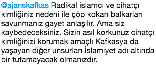 Adamlar kendi milliyetçi histerilerini yanı başındaki kendinden sayıca çok daha az bir halkın (bir önceki yazıdaki garibandan kastım budur) üzerinde tepinerek okşayacak (aynı şey Karaçay-Çerkes’te sayıca azınlık olan Çerkeslere karşı yapılsa yine tepki göstereceğiz), sizler de bu hastalıklı kafayı es geçip, bizlere sükunet telkin edip Don Kişotlukla itham edeceksiniz.