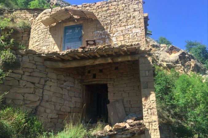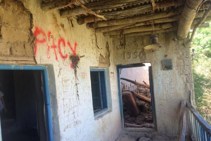 Köyün girişinde terk edilmiş evin duvarındaki bir yazı: ‘Lütfen koyunlarını iz boyunca sürün. Köy idaresi.’