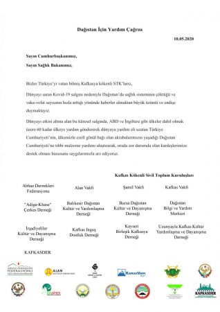 Bizler Türkiye’yi vatan bilmiş Kafkasya kökenli STK’larıyız. Dünyayı saran Kovid-19 salgını nedeniyle Dağıstan’da sağlık sisteminin çöktüğü ve vaka-vefat sayısının hızla arttığı yönünde haberler almaktan büyük üzüntü ve endişe duymaktayız.