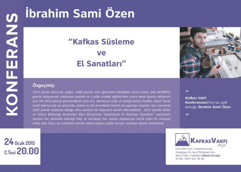Haber Konferans; “Kafkas Süsleme ve El sanatları” 22 Ocak 2015, 23:56 Kafkas Vakfı’nın her ay düzenlediği konferans dizisinin bu ayki konuğu İbrahim Sami Özen.24 Ocak Cumartesi akşamı Kafkas Vakfı konferans salonunda gerçekleştirilecek...